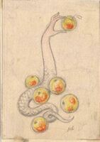 Tigre Juan. Una serpiente que la cabeza es una mano, en la parte superior de la ilustración, en la que tiene una manzana entre sus dedos, más abajo cinco manzanas alrededor de su cuerpo ya en la parte central e inferior de la ilustración. En cada manzana dibujado en rojo un corazón. La firma en la parte inferior hacia la derecha.Prueba de imprenta. Ilustración realizada para la revista semanal de Novelas y Cuentos. Titulo: Tigre Julan.; Autor: Ramón Pérez de Ayala. Nº publicado: 973. . Fecha: 01 01 1950. Tomo NC. 52.