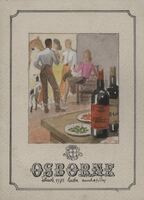 Tomando una copita Cartel enmarcado de las bodegas Osborne, donde en primer término aparece la esquina de una mesa con dos botellas y unos platos de canapés, al fondo la escena de dos parejas charlando mientras toman una copita, las mujeres una ellas sentada y la otra junto a un caballo y un perro y los hombres van vestidos de corto.