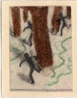 TOM SAWYER DETECTIVE. Líneas verdes y ondulantes dan la sensación de crear movimientos de agua o de caminos. Unas sombras corren apresuradamente. Anclados al suelo hay largos y gruesos palotes marrones que representan los árboles. El dibujo está enmarcado.Boceto realizado para la ilustración de la revista semanal Novelas y cuentos. Titulo: Tom Sawyer detective. Autor: Mark Twuin. Nº publicado: 1011. Fecha: 24-09-1950. Tomo NC. 28. PI/. 450