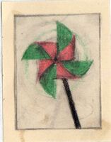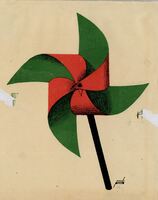 UN ALMA FUERTE. La figura enmarcada que se realiza en este dibujo es una flor de viento verde y rosa. A su alrededor unas manchas verdes sutilmente pintadas sugieren una sensación de movimiento. La flor de viento se sostiene por un palo largo y negro.Boceto realizado para la ilustración de la revista semanal Novelas y Cuentos. Titulo: Un alma Fuerte. Autor: Jorge Ohuet. Nº publicado: 1105. Fecha: 13-07-1952. Tomo NC.: 52. PI/. 70
