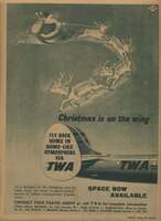 Twa Cartel publicitario navideño de la compañía aérea Twa, donde se representa la cola del avión donde se puede leer el rótulo correspondiente al anuncio junto a la figura de Papa Noel tirado por sus renos.