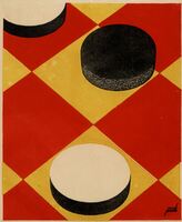 Tres piezas de damas Sobre un tablero con los cuadrados en color amarillo y rojo se ven tres piezas redondas del juego de damas: dos son blancas y negras y otra es totalmente negra. También sobre el tablero se aprecia la firma del artista.Prueba de imprenta. Ilustración realizada para la revista semanal Novelas y Cuentos. Titulo: Autor: Nº publicado: Fecha: Tomo NC.: