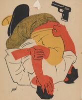 TRAGICA HERENCIA. Una mujer serpiente con el cuerpo de reptil verde enrollado en su extremidad y cabeza humana coge en sus manos una pistola que dispara. La figura se halla de perfil y enmarcada en este dibujo donde también se destaca el boceto de la firma del pintor.Boceto realizado para la ilustración de la revista semanal Novelas y Cuentos. Titilo: trágica herencia. Autor: A. du Maurier. Nº publicado: 1312. Fecha: 07-07-1956. Tomo NC.: 57.